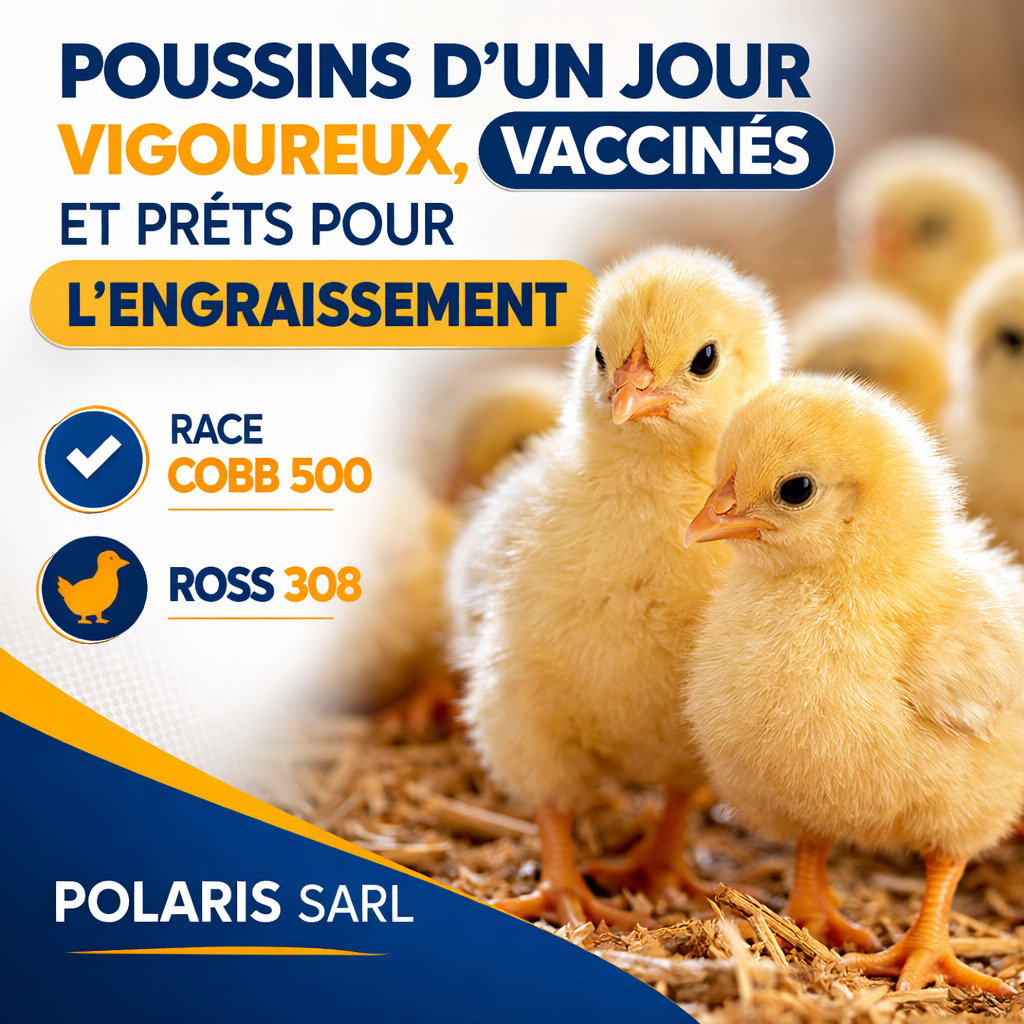 Poussins d'un jour vigoureux, vaccinés et prêts pour l'engraissement.